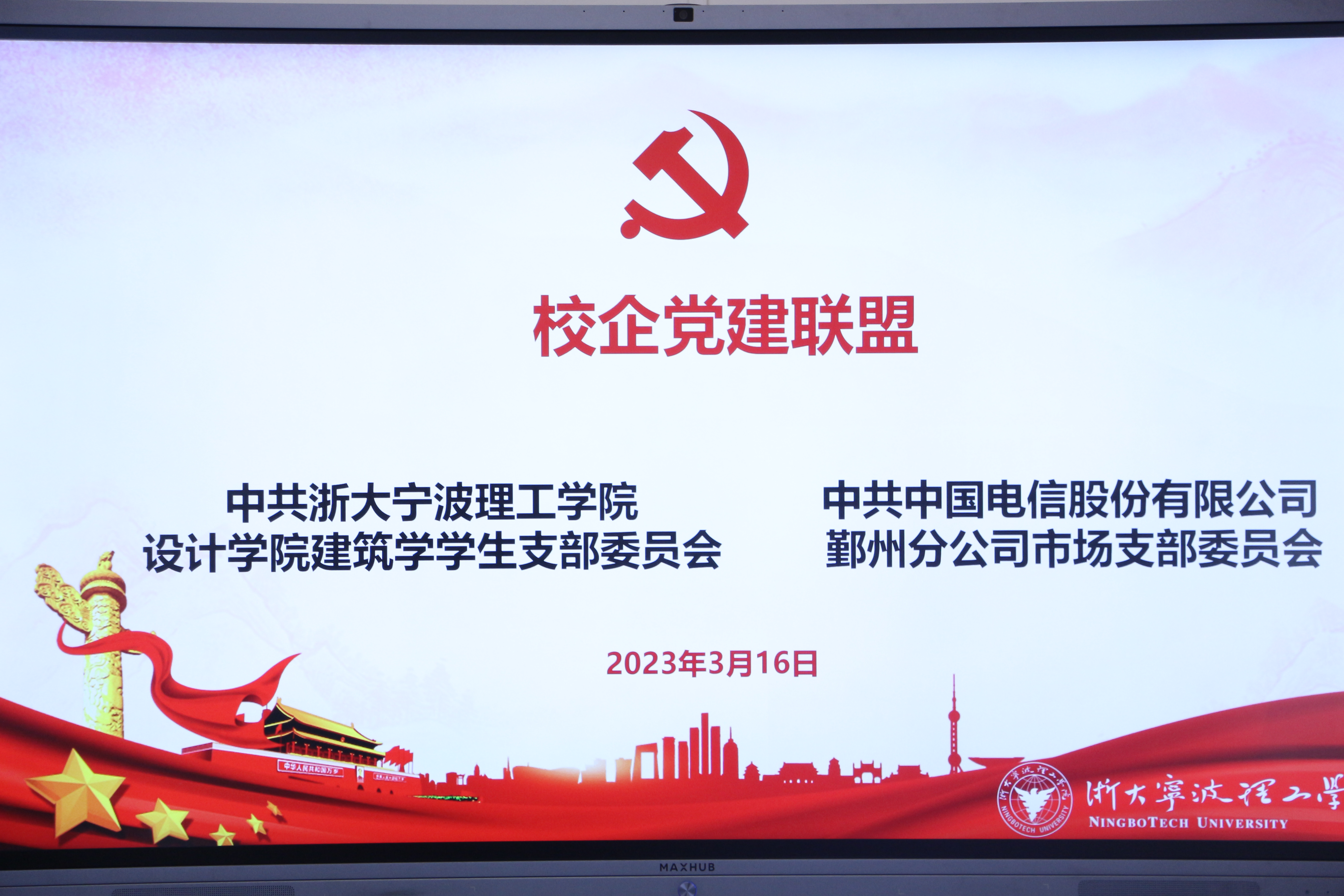 为深入贯彻落实党的二十大精神,加强产学研合作,提高学生就业核心竞争力,推进毕业生重点领域就业,3月16日下午,设计学院与中国电信股份有限公司鄞州分公司在SE306会议室举行校企党建联盟签约仪式。中国电信股份有限公司鄞州分公司党委委员、副总经理王俞赛,市场党支部书记邵海江,组织委员施琼英,纪检兼宣传委员李斌,分公司党委办干事蔡萍萍;设计学院党委书记吴春,党委副书记兼纪委书记叶卫树出席,教师代表以及建筑学学生党支部党员参加。仪式由建筑学学生党支部书记周鑫磊主持。