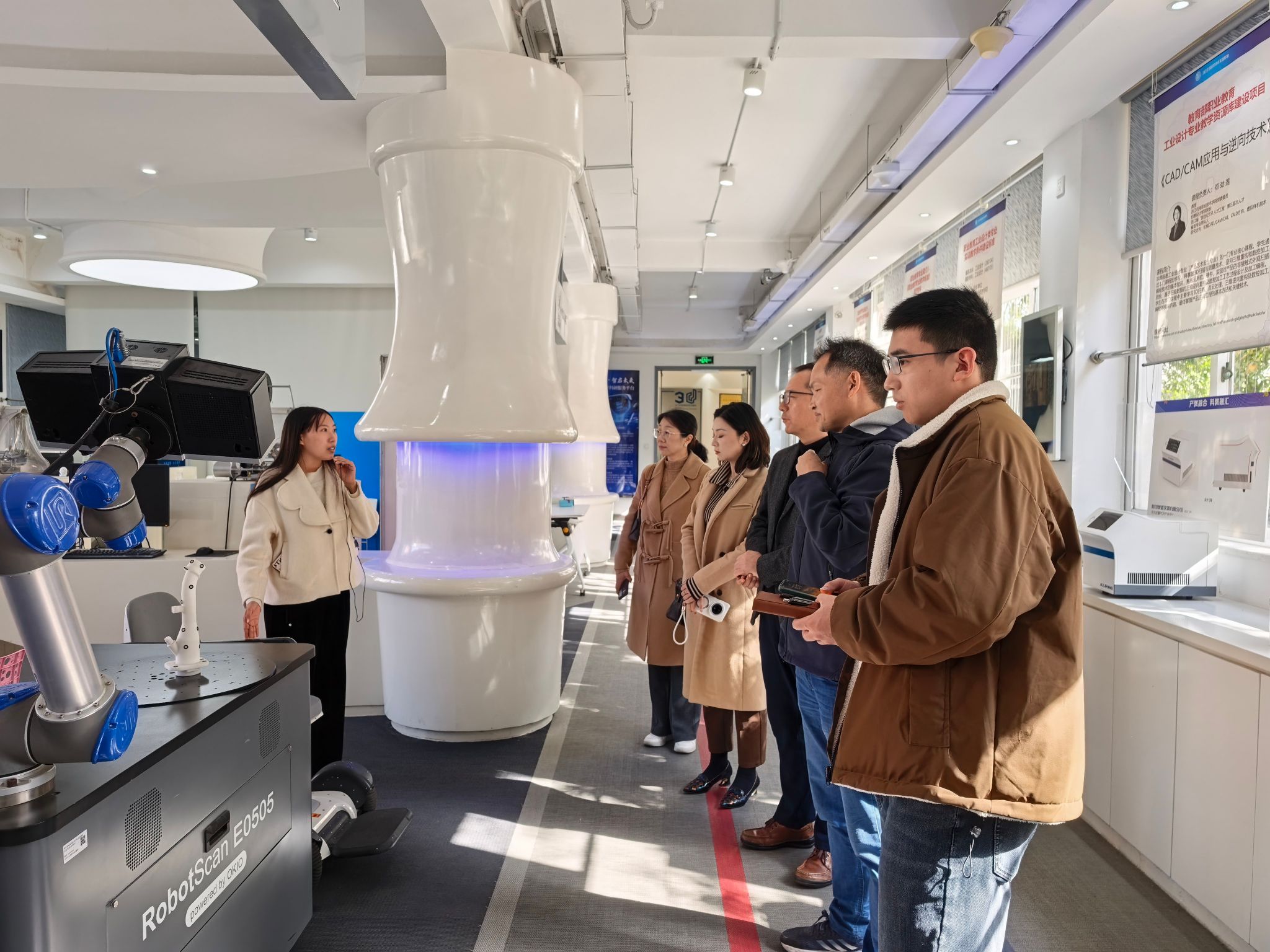 设计学院一行还参观了浙江机电职业技术大学创意设计学院的3D打印应用技术实训基地,对创客教学区、数字化扫描区、打印体验区进行了深入了解和实操体验,并参观了文创产品手作工坊,对创意设计学院师生设计的首饰、木作、草木染、红色文创等产品进行了观摩学习。