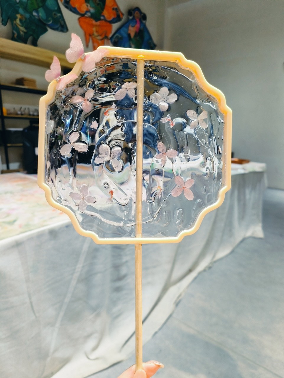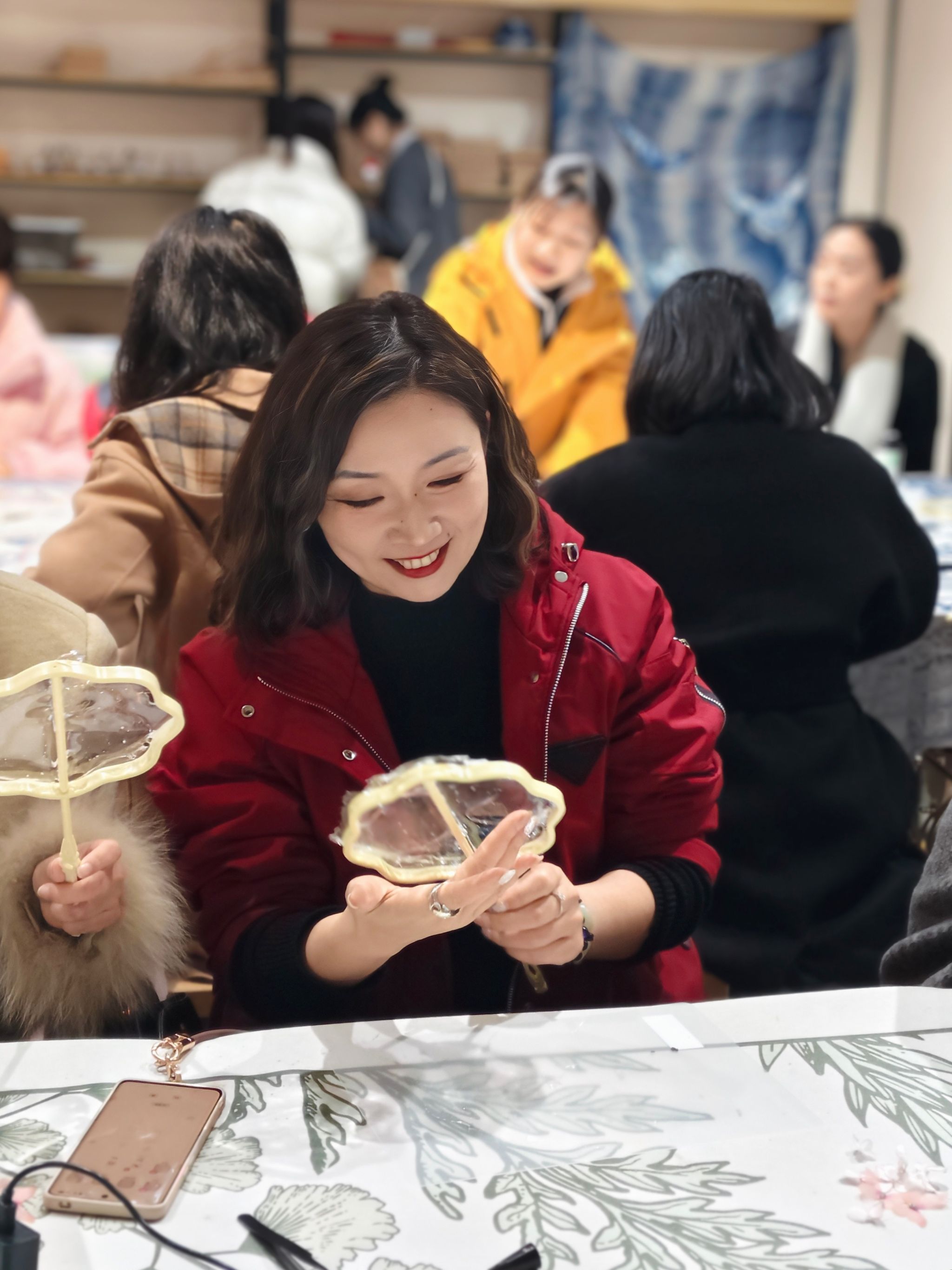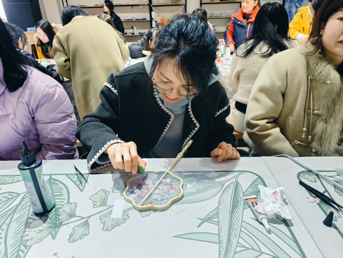 活动当天,先是前往非遗文创馆进行美学手作,大家以“桃花锦鲤流水扇”制作为主题,在专业老师指导下,将象征福运的桃花与锦鲤融入扇面设计。染色、拼接、装裱间,传统技法与现代创意碰撞,欢声笑语中,一件件寓意吉祥的手工艺品跃然成型。“在节日里亲手制作非遗艺术品,既有趣又有意义!”一位老师感慨道。