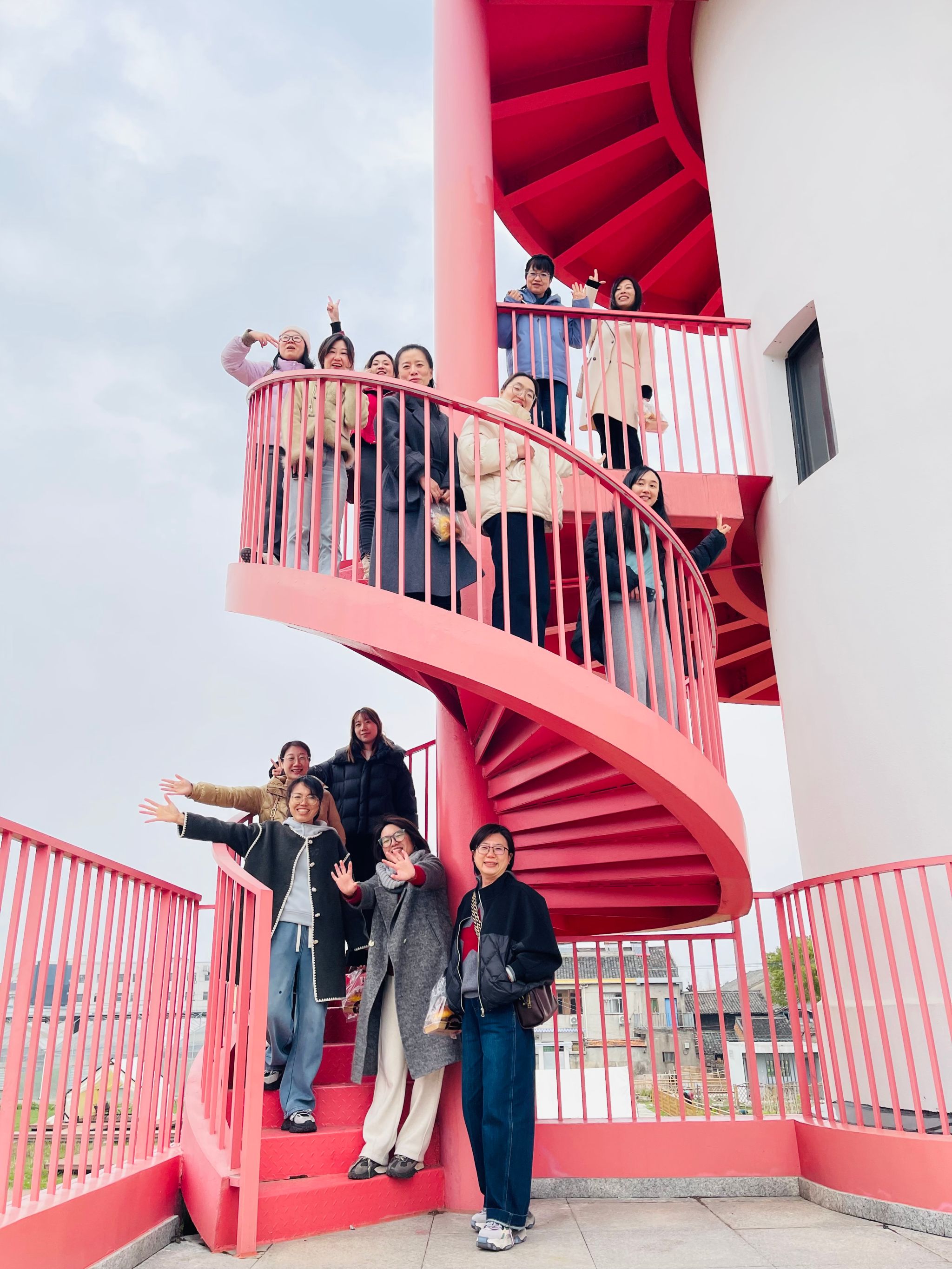 最后,女教职工们步行返回河畔营地,途径历史悠久的青阳观、羊府庙,穿过具有“一桥两名”的尚书桥(石马塘),并在营地旁的观景塔上打卡点拍下了合照。