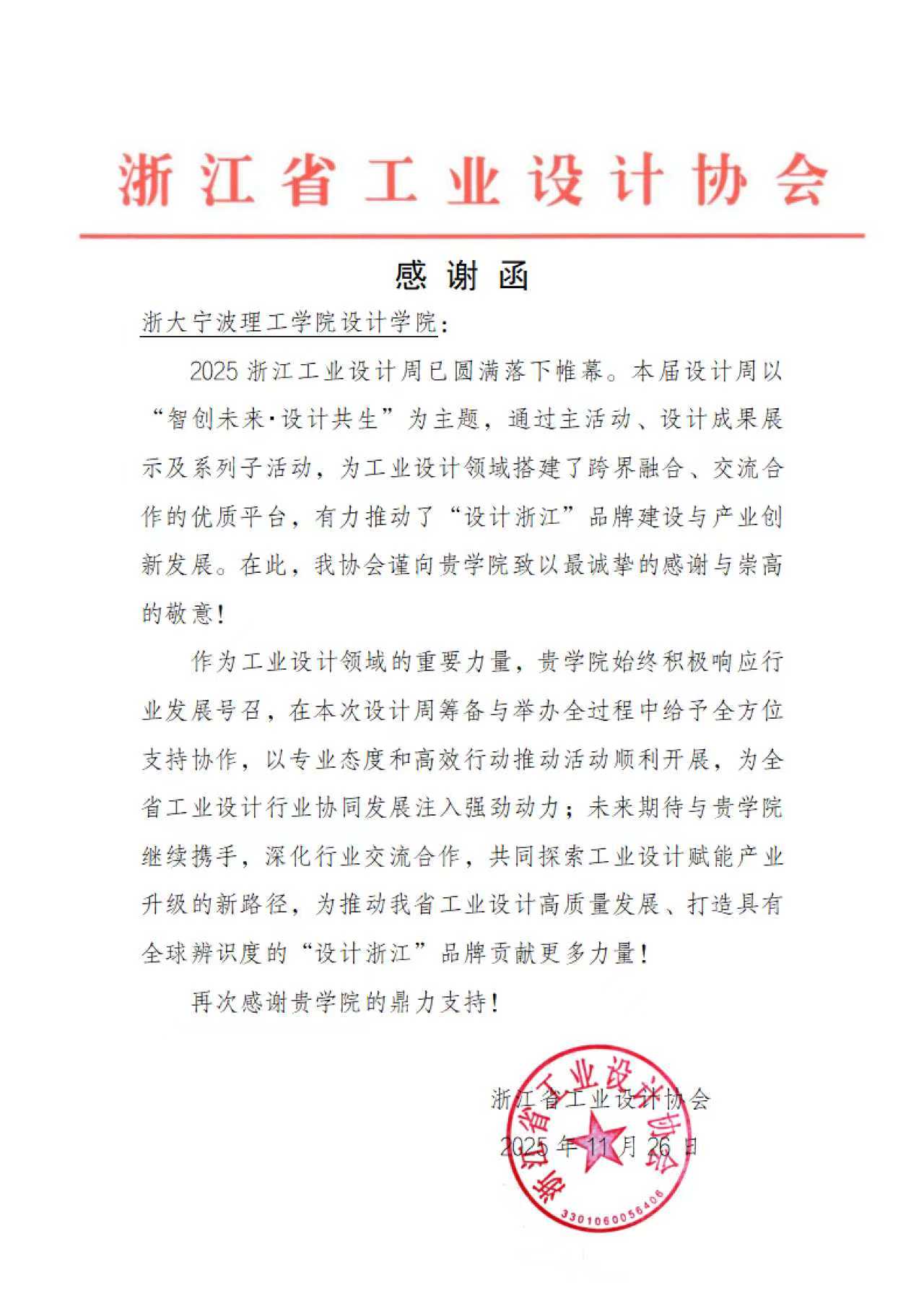 浙大宁波理工学院设计学院主动响应行业发展,积极参与本届设计周的筹备与举办工作,在承办分论坛、联系讲座嘉宾、提供志愿服务等方面给予设计周全方位的支持与协作。浙江省工业设计协会特意发来感谢信,对设计学院以专业态度和高效行动推动活动顺利开展表示感谢。