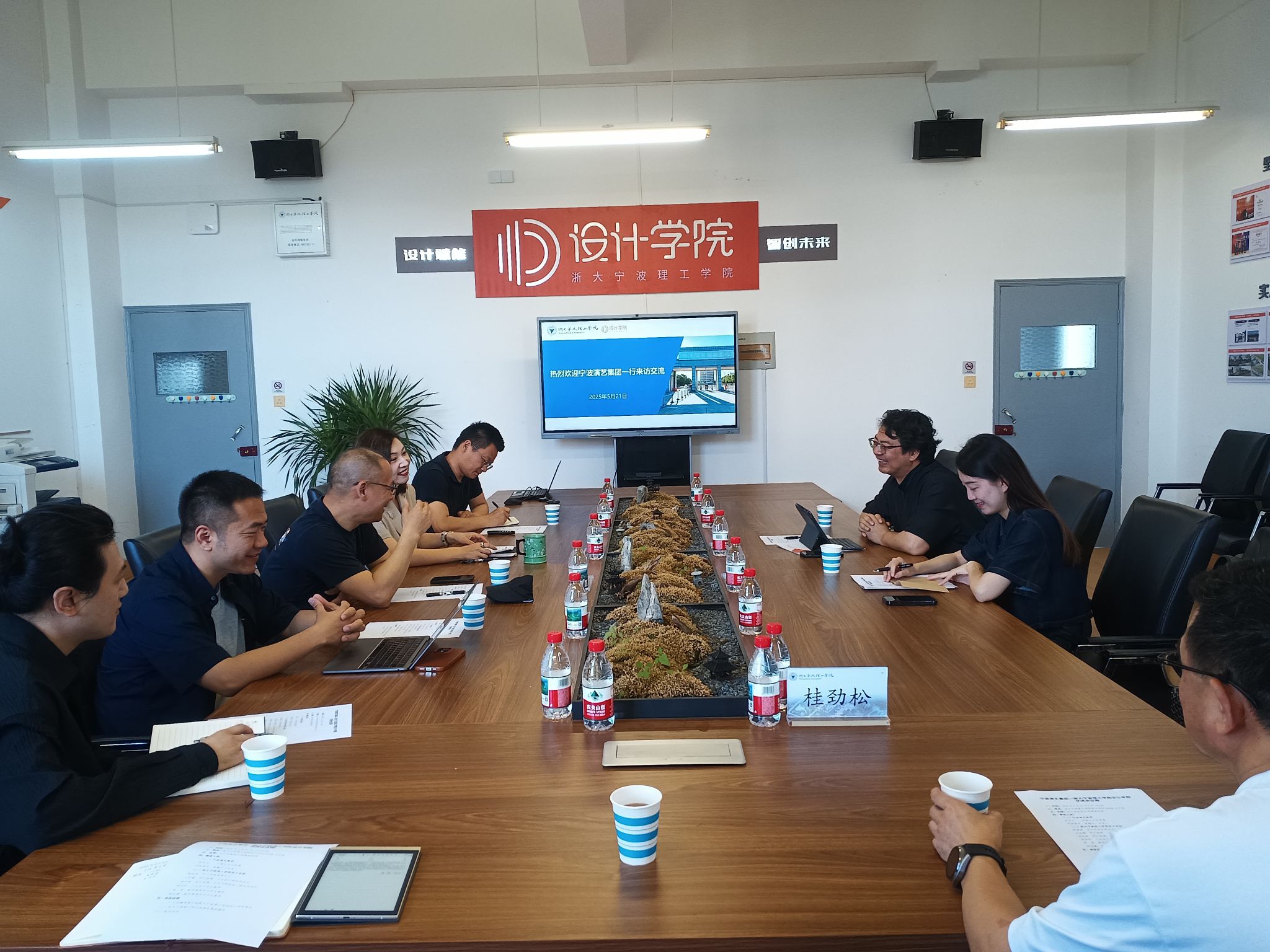 5月21日上午,宁波演艺集团开演文化总经理林木凡、直播中心负责人邱裕紫禾一行来访浙大宁波理工学院设计学院,双方在设计学院SE306会议室座谈交流。设计学院党委书记韩晶晶、院长助理、工业设计研究所所长王祖耀、院长助理、艺术与科技设计研究所所长励宇辉及骨干教师桂劲松、陈昱、陈冠羲等参加座谈。