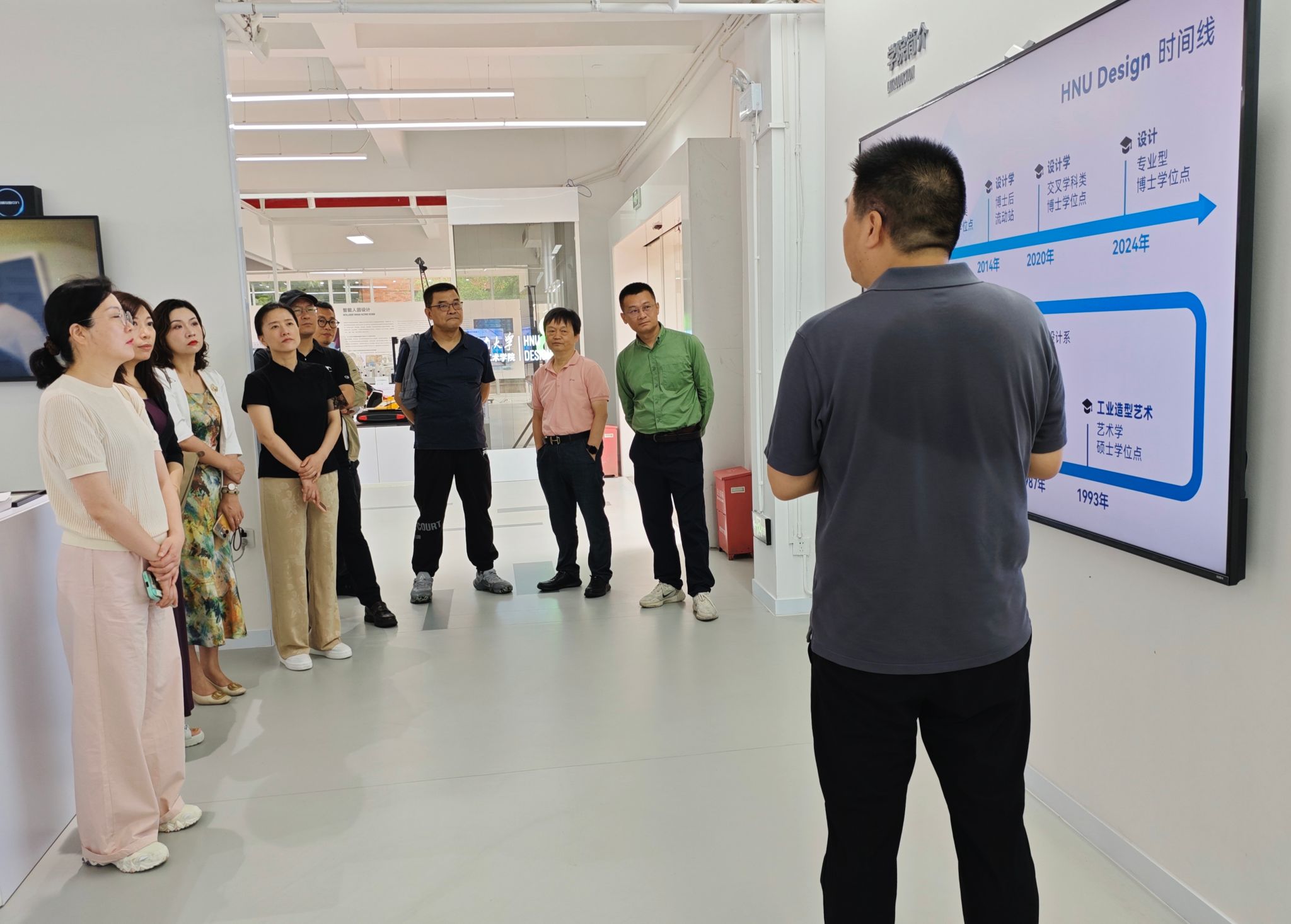 在湖南大学设计艺术学院,调研团实地考察了湖南省岳麓山工业设计创新中心麓山实验室、工业设计发源地四合院、湖南省工业设计协会、文化科技融合战略研究室等,深入了解了设计艺术学院的历史沿革、重要荣誉、教研教改、科学研究、社会服务等情况,详细参观了智能人因设计、数字文化创新、智慧健康、数据智能与服务设计、可持续与生态设计、文化科技融合、智能产品与装备、智慧出行等领域的最新设计成果,为我院深化教学改革、凝练科研方向提供了宝贵经验和重要启发。
