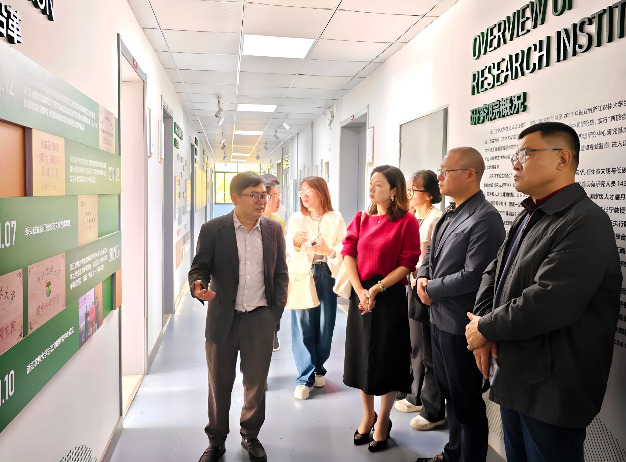 设计学院一行实地参观了浙江农林大学生态文明研究院、碳中和研究院,在研究院副院长钱志权教授的详细讲解下,调研团深入了解了研究院的历史沿革、组织机构、学术委员会、合作机制等情况以及智库联盟建设、研究特色、成果获奖、资政研究、媒体报道、学术交流、社会服务等成果。2021年6月,浙江农林大学生态文明研究院、碳中和研究院实行“两院合一”运行机制,2021年9月获批准为浙江省习近平新时代中国特色社会主义思想研究中心研究基地。2022年12月获批为浙江省新型重点专业智库,入选全省首批建设具有全国影响的省级新型智库培育名单,是浙江省生态文明智库联盟牵头单位,承担国自科重大重点、国社科重大重点、973项目在内的国家级、省部级项目250余项,在国内外重要学术期刊发表学术论文1000余篇,出版学术著作160余部,获国家科技进步奖等省部级以上成果奖近50项,发明专利20余项,资政咨询报告获国家级、省部级批示100余次,产生了较大的学术影响、良好的社会影响和重要的决策影响。