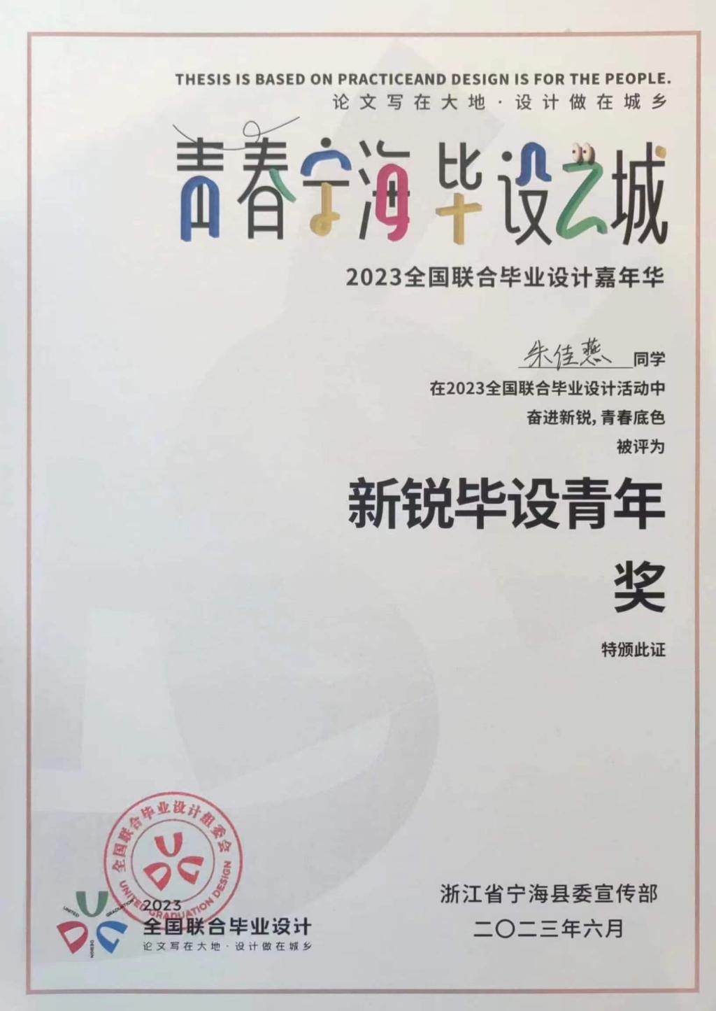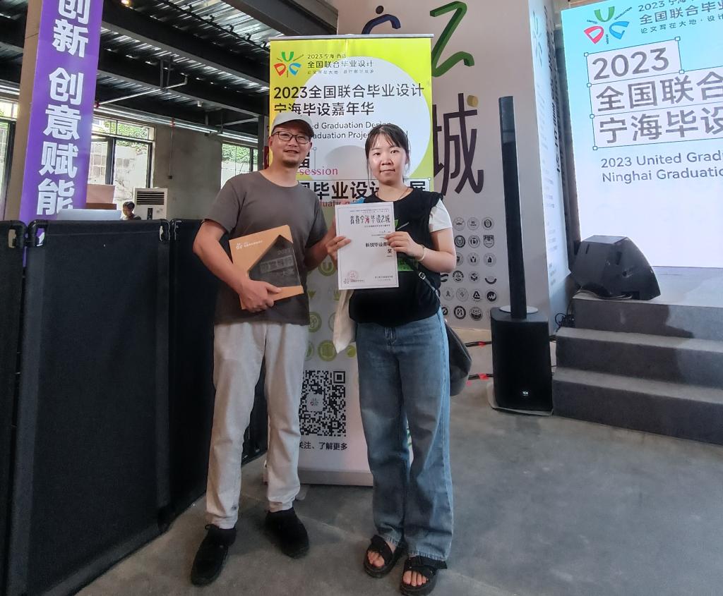 2023全国联合毕业设计答辩及展览于6月20日在宁海县的“来in南”互联网文创园举行。今年的主题是“艺术振兴乡村”。我校设计学院共有6份优秀作品入选决赛,最终,建筑学181班朱佳燕同学的作品《基于场所精神的宁海团堧村公共空间改造提升规划建筑设计方案》获得了“新锐毕设青年奖”,并获得2000元奖金。建筑系范俊杰老师获得“殿堂导师奖”。