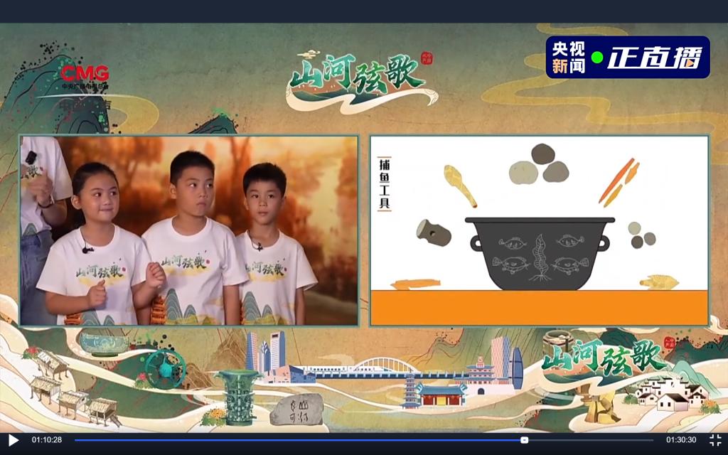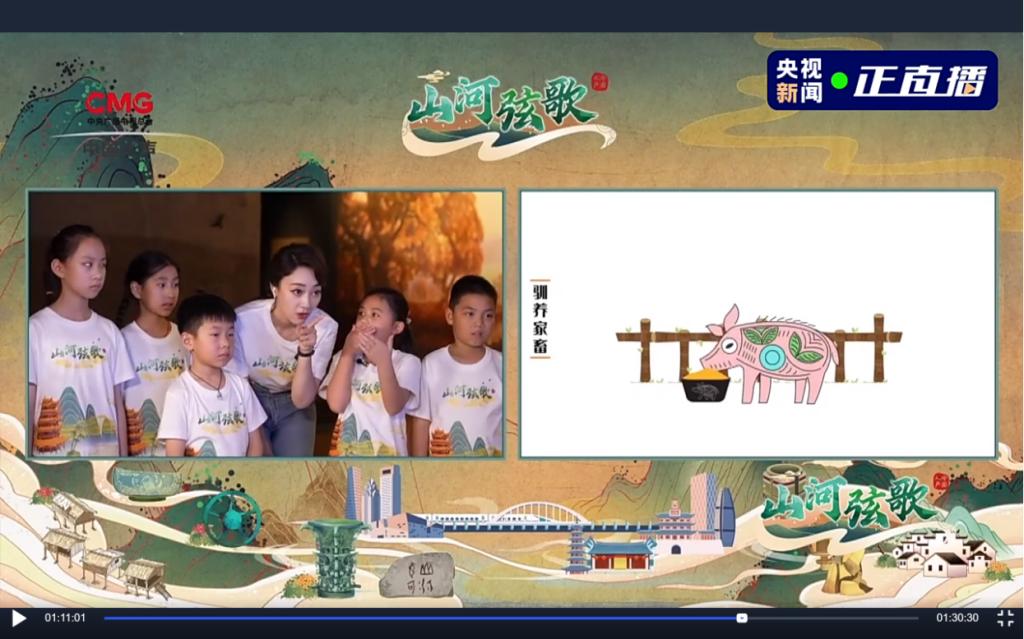 在节目中,有一段由央视主持人带领一群小朋友组成的山河弦歌研学团参观研习河姆渡文化,在研学之旅中有一段特别准备的短片《器说河姆渡》,以创新的动画表现形式,把7000年前新石器时代河姆渡人的生产生活场景生动的呈现出来,从泛舟捕鱼、搭弓猎兽、驯养家禽到骨耜耕土、点种播稻、谷镰收割、到煮蚕抽丝、纺轮织布等等,让研学团的小朋友们在欢快的音乐节奏中以新颖的形式感受古人智慧、领略远古河姆渡文化。