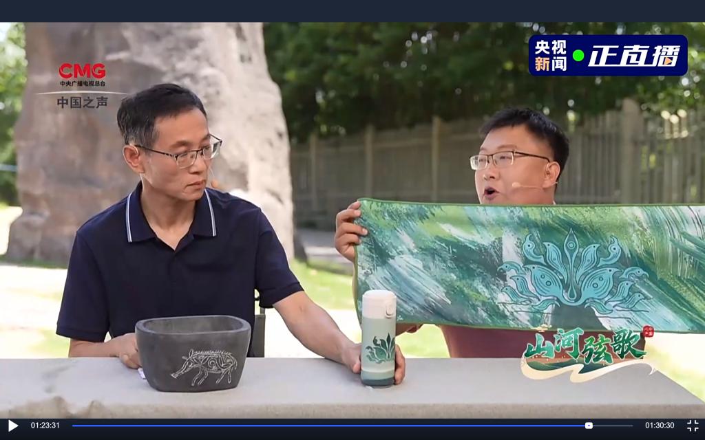 在节目的最后,受邀嘉宾计算机与数据工程学院党委书记、数字文化创新中心副主任于欣展示了由数字文化创新班同学创造的文创作品。为准备这次作品,创新班导师传媒与法学院专任教师马琳、副院长王军伟,设计学院专任教师姜燚威等组织了几组同学并进行指导,最终创新班工业设计专业董涵彦同学主笔设计,运用智能生成式创新方法,提炼河姆渡文化元素,结合现代审美需求的一套两件文创衍生品被选出,作品蓝绿相融的色调似乎带来丝丝凉意,正契合于酷暑炎热的盛夏。