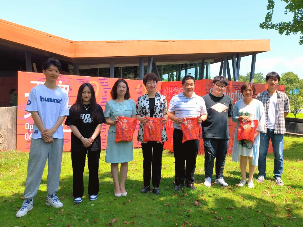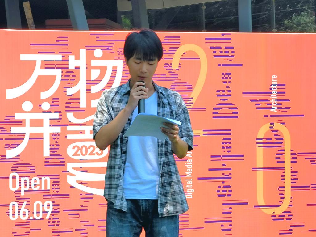 随后,工业设计专业乔怡卓同学作为毕业生代表发言,感谢母校的精心培养,祝愿母校越办越好。毕业生代表们为老师们回赠了一份神秘小礼物——毕业生自己设计的作品表达感谢。最后,吴春宣布,浙大宁波理工学院设计学院2023届优秀毕业设计展开幕!