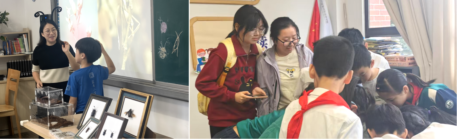 在团队指导老师贾鑫的指导下,徐萍和詹一佳两位同学通过生动的讲解和有趣的互动,带领孩子们走进一个神秘而充满惊喜的昆虫世界。课堂上,孩子们认真聆听,积极互动,展现出强烈的学习热情,小脸上洋溢着好奇和兴奋,仿佛每一个问题都是打开新世界的大门。