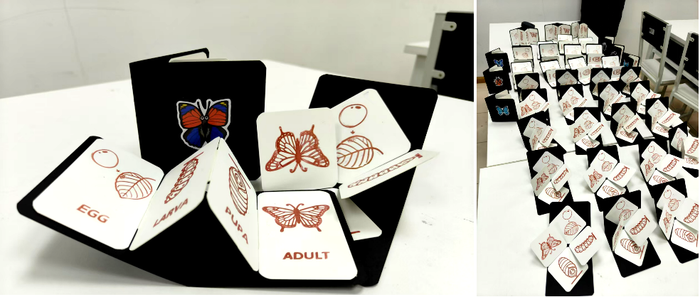 为了打造一节充满创意和乐趣的课程,国创团队投入了大量的时间与精力进行了准备。从选材到设计活动流程,每一个细节都力求精益求精。团队成员深入研究昆虫的发育过程,特别制作了昆虫生命周期四阶段的简易立体小书。这本小书通过生动的插图和精巧的立体结构,直观展示了昆虫从卵到成虫的全过程,让孩子们在动手翻阅中加深对昆虫生命周期的理解。