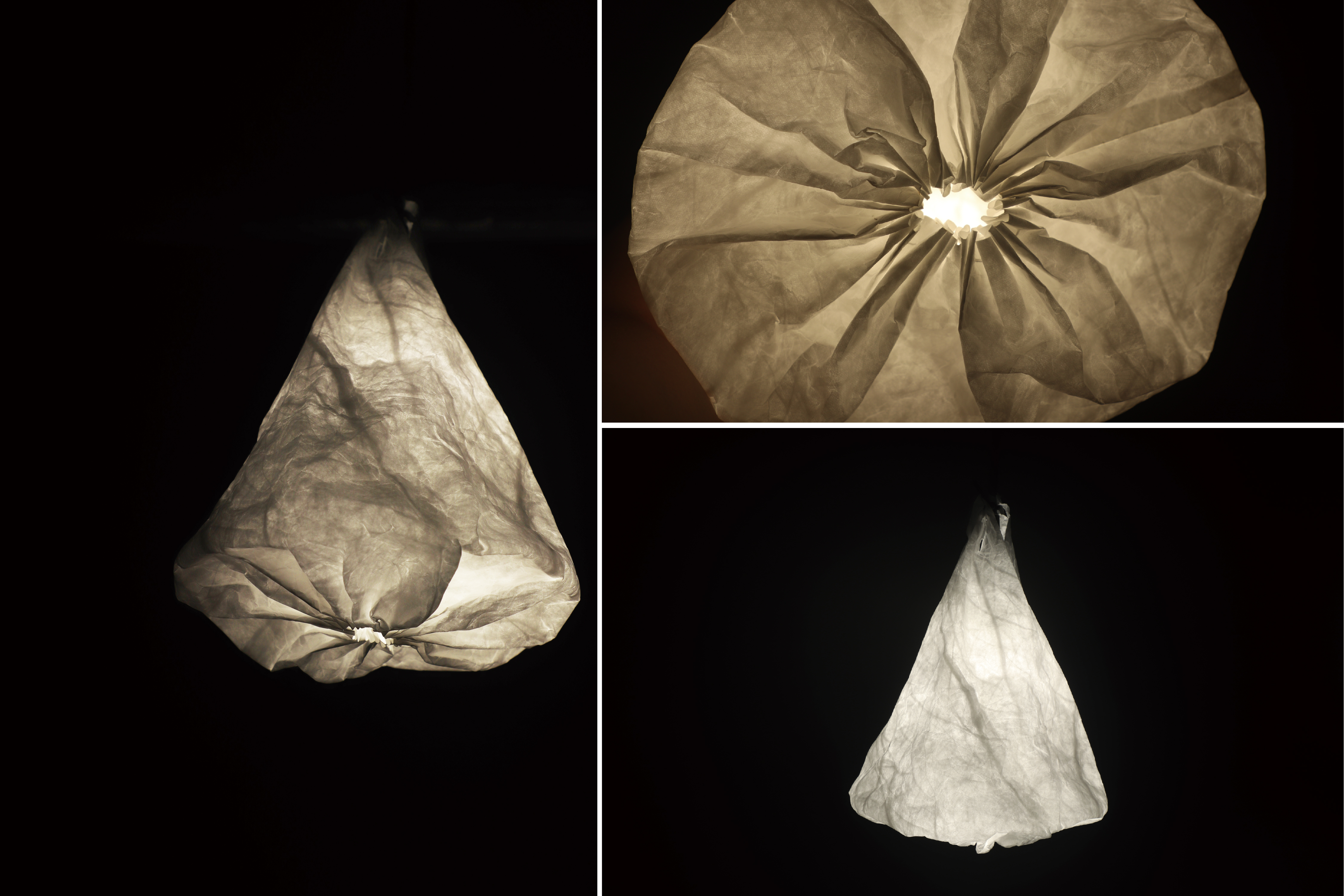 将杜邦纸通过褶皱、染色、切割、编织等手段的处理制作成形态各异的灯罩,令透过的光线变得千姿百态。在杜邦纸外层罩上一层黑色不透光卡纸,由用户亲手撕开卡纸,撕出想要的光线形状,为了卡纸容易撕开,在卡纸上雕刻了等边三角形阵列的易撕线。灯灭时,是五个形态大同小异的几何体,亮灯后,光线却能在人的参与下拥有无尽可能。