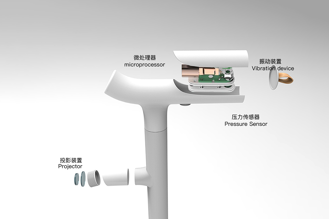 对于帕金森病人来说,步态冻结的问题困扰了他们的生活,在走路时,他们会突然迈不开步,脚好像被黏在了地上,四肢不听大脑的指挥。这个毛病禁锢了病人的生活范围,大大增加了他们的苦闷和烦恼。目前研究利用感官刺激可以帮助病人恢复大脑的反应。这款辅助步行器设计利用投影技术和震动来实现视觉和触觉的双重刺激,意图缓解步态冻结的困扰,加快他们的反应速度和步伐行走速度。同时改产品配合专门为病人使用的APP,鼓励病人之间多多交流,扩大帕金森病友的社交圈,帮他们建立更好的人际关系。