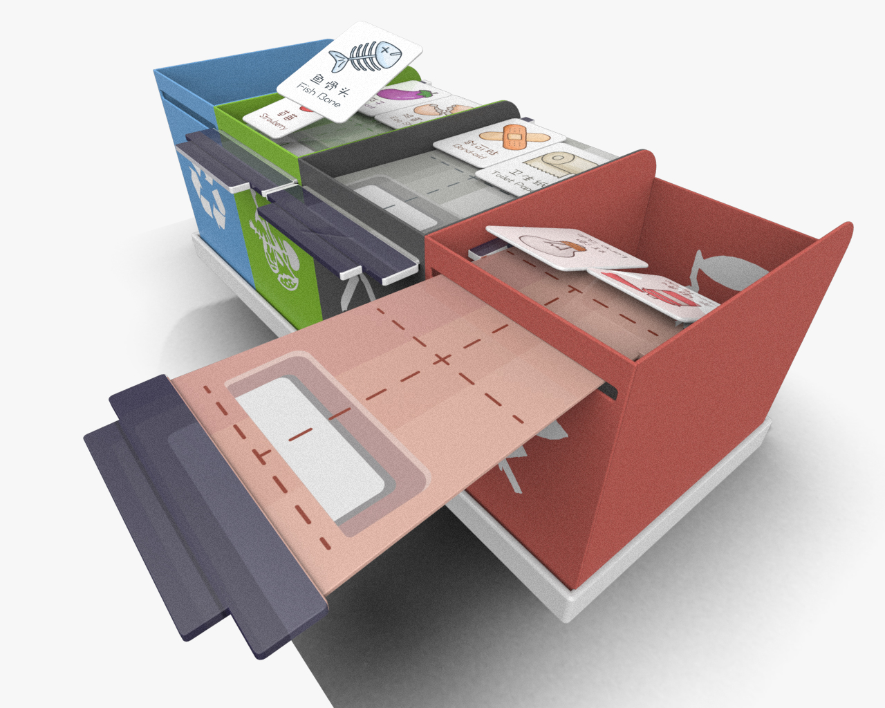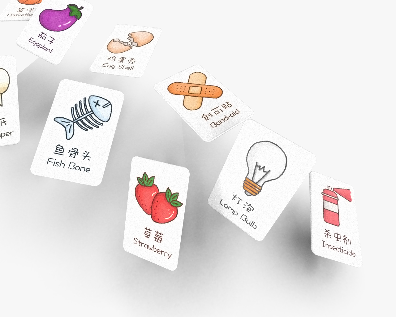 教具套装由包装盒、四个可折叠垃圾桶道具、四种分类卡牌、平面垃圾桶卡牌、奖励道具组成,视觉为蜡笔画风格,清新可爱;卡牌结合双语,中文名称下有相对应的英文单词在识别图片和垃圾种类的同时也可以学习英文单词,促进孩子的语感。