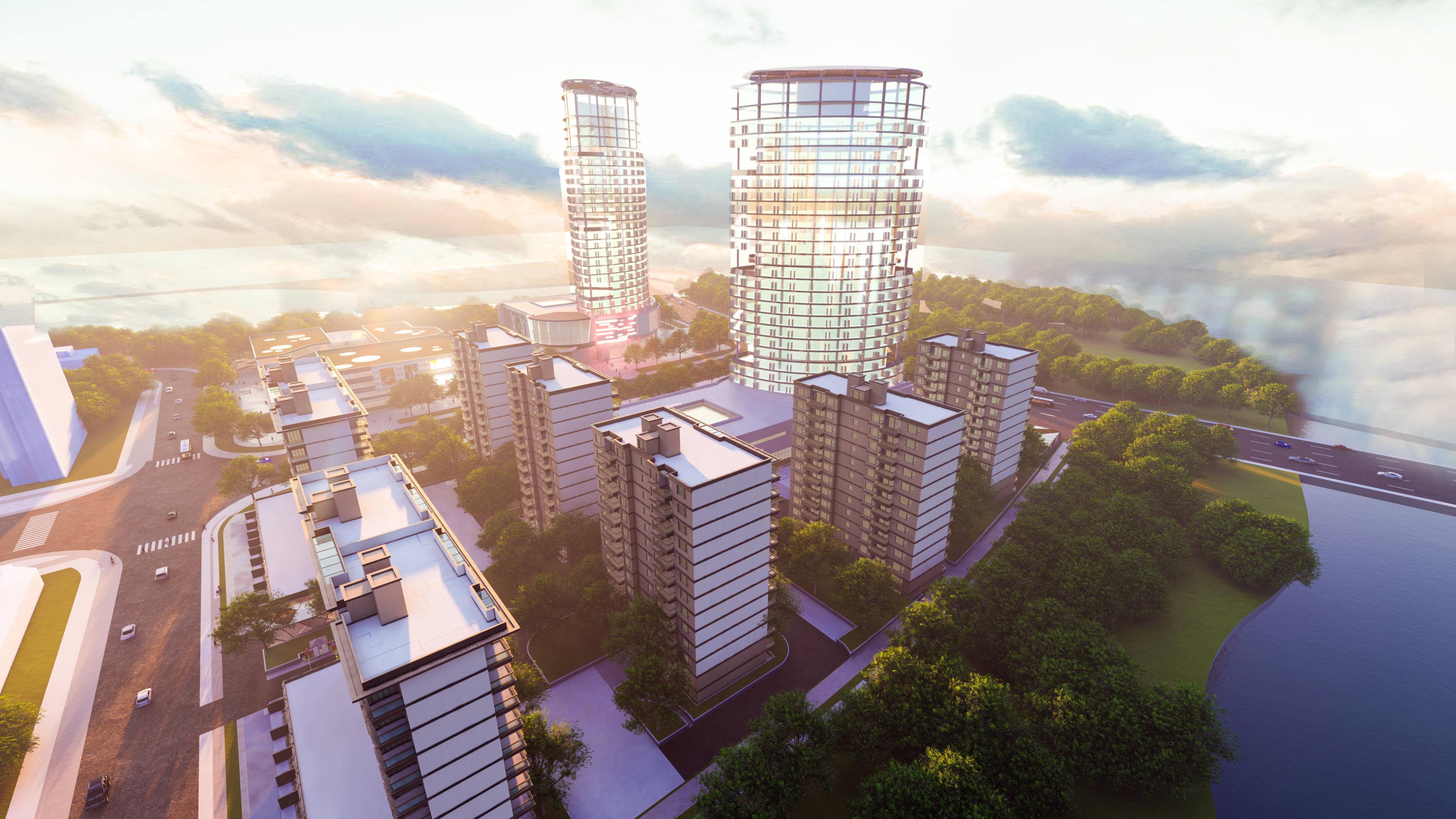 本方案的设计应由周边的自然环境出发,周边山水相伴,建筑形态多样,但多为现代风格的住宅及其他公共建筑,整体风貌体现了宁海县的时代发展。本设计注重体块的穿插咬合,材质的虚实对比以及建筑细部的光影表现,主体塔楼较为通透,一是为了体现新时代建筑的特征,二是为了更好的将周边景观尽收眼底,裙房更加侧重与环境的呼应,大面积的屋顶绿化使得建筑融入环境,让人们能感受到自然的亲和感。整个设计能很好的展现宁海县的经济情况,也能成为营造新的城市天际线,形成新的城市地标。