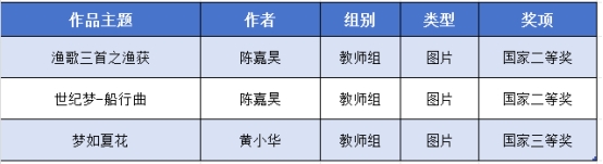 教师组作品中,陈嘉昊老师的作品《渔歌三首之渔获》和《世纪梦-船行曲》分别斩获国家二等奖,黄小华老师的作品《梦如夏花》斩获国家三等奖,不仅彰显了我校设计学院教师独特的艺术魅力和深刻的文化内涵,也充分展现了他们卓越的设计才华和深厚的艺术修养。