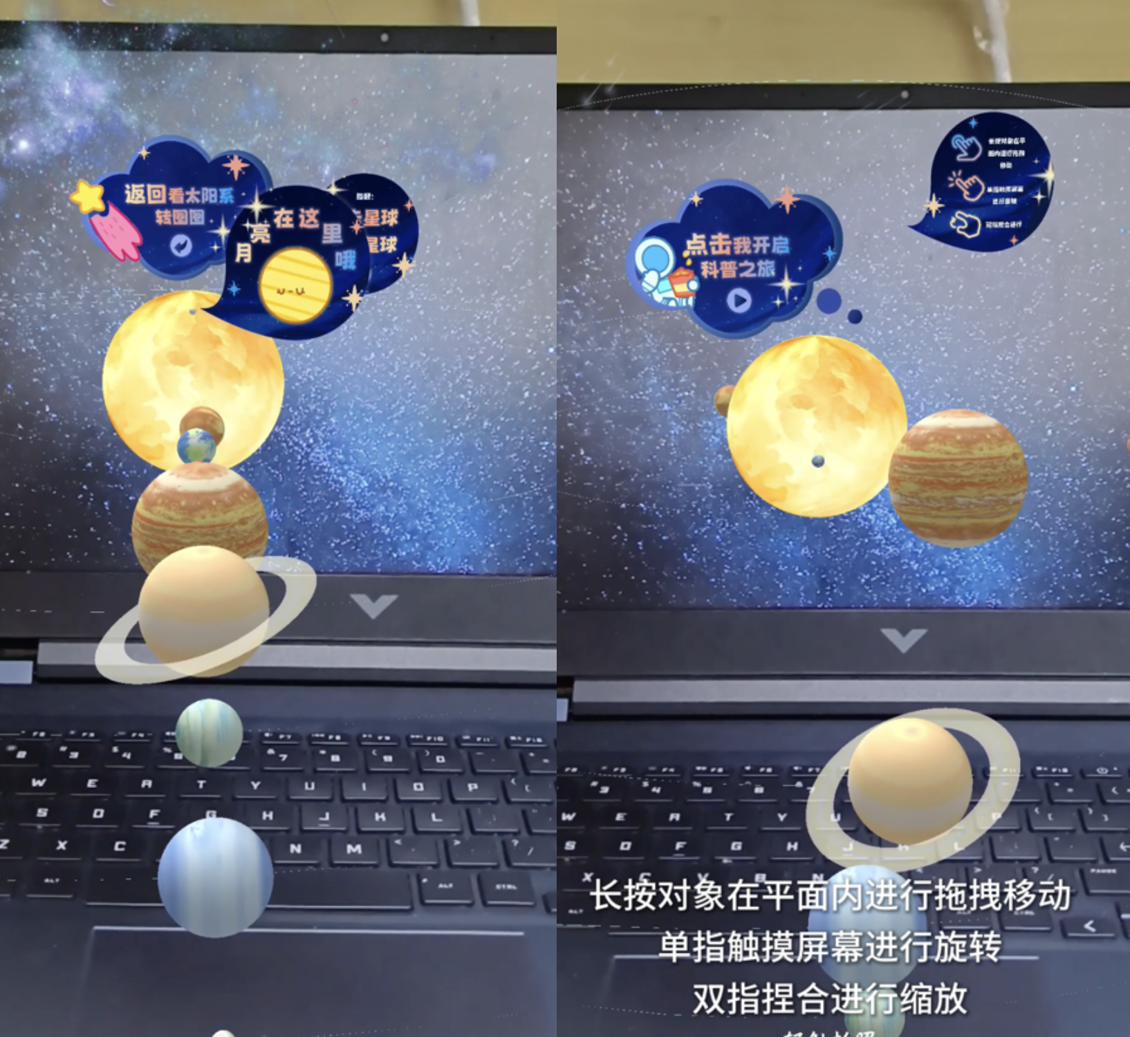 太阳系知识抽象,4-8岁儿童抽象思维未成熟,现有AR太阳系科普产品、交互逻辑偏小学以上,界面复杂、操作多,不符合幼儿认知习惯,使用门槛高,兴趣激发不足。本设计针对4-8岁儿童设计、以太阳系为核心、轻量化零门槛的纯AR科普产品。通过AR技术将太阳系带到儿童身边,实现沉浸式认知,助其建立太阳系世界观。