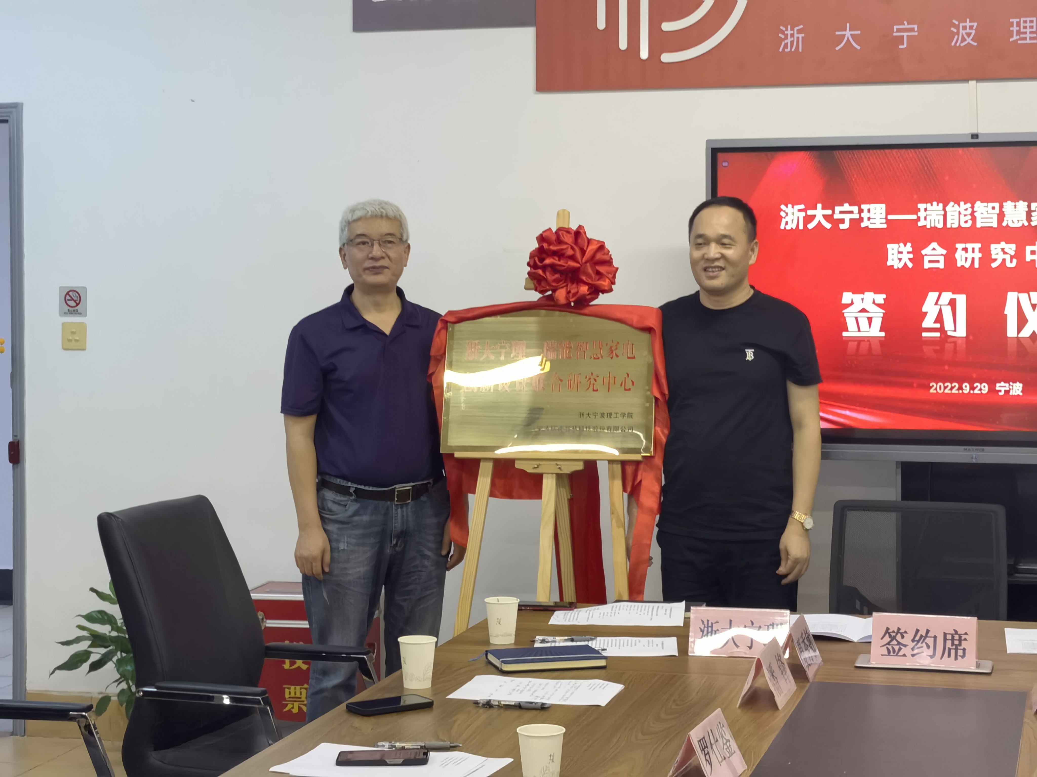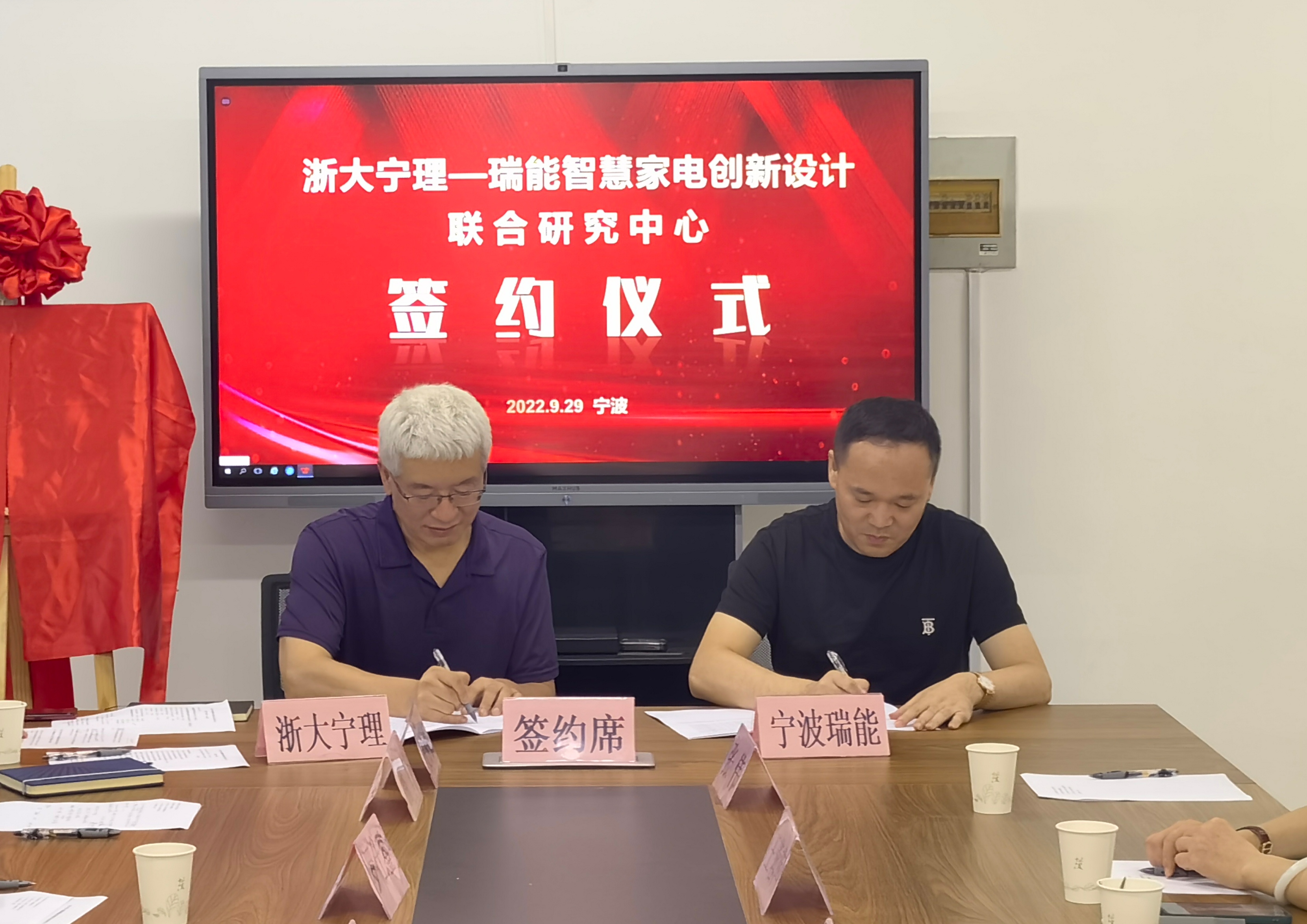 9月29日上午,由浙大宁波理工学院与宁波瑞能智慧科技股份有限公司共建的“浙大宁理—瑞能智慧家电创新设计联合研究中心”正式签约成立。签约仪式在浙大宁波理工学院设计学院SE306会议室举行。宁波瑞能智慧科技股份有限公司董事长唐瑞峰、总经理王蓉萍、国际贸易部部长张伟、研发部部长陈红伟,浙大宁波理工学院科研处副处长于在河、地方合作处副主管潘锋、设计学院长罗仕鉴、党委书记吴春、副书记叶卫树、副院长赵建国出席,设计学院工业设计研究所相关教师参加签约仪式。仪式由设计学院院长助理夏秀敏主持。