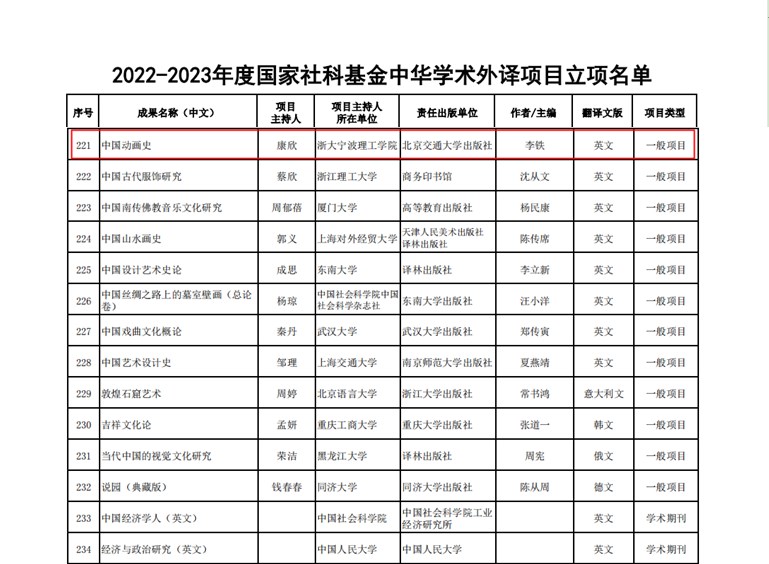 近日,全国哲学社会科学工作办公室公布了2022-2023年度国家社科基金中华学术外译项目立项名单,设计学院康欣博士主持的《中国动画史》获批立项,实现学院国家基金项目“零”的突破。该项目与北京交通大学出版社共同申报,申报过程中得到了外国语学院执行院长蔡亮教授的精心指导,英译本拟在德国施普林格·自然出版集团(Springer Nature Group)出版,面向全世界发行。