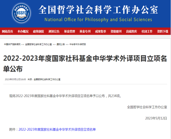 中华学术外译项目是国家社科基金项目主要类别之一,侧重于资助中外学界共同认可的代表中国学术水准、体现中华文化精髓、反映中国学术前沿的学术精品,以外文形式在国外权威出版机构出版,并进入国外主流发行传播渠道,旨在发挥国家社科基金的示范引导作用,增进世界了解中国和中国学术,增强中国学术国际影响力和国际话语权,不断提升国家文化软实力,是推动中国哲学社会科学走出去的一个重要平台。