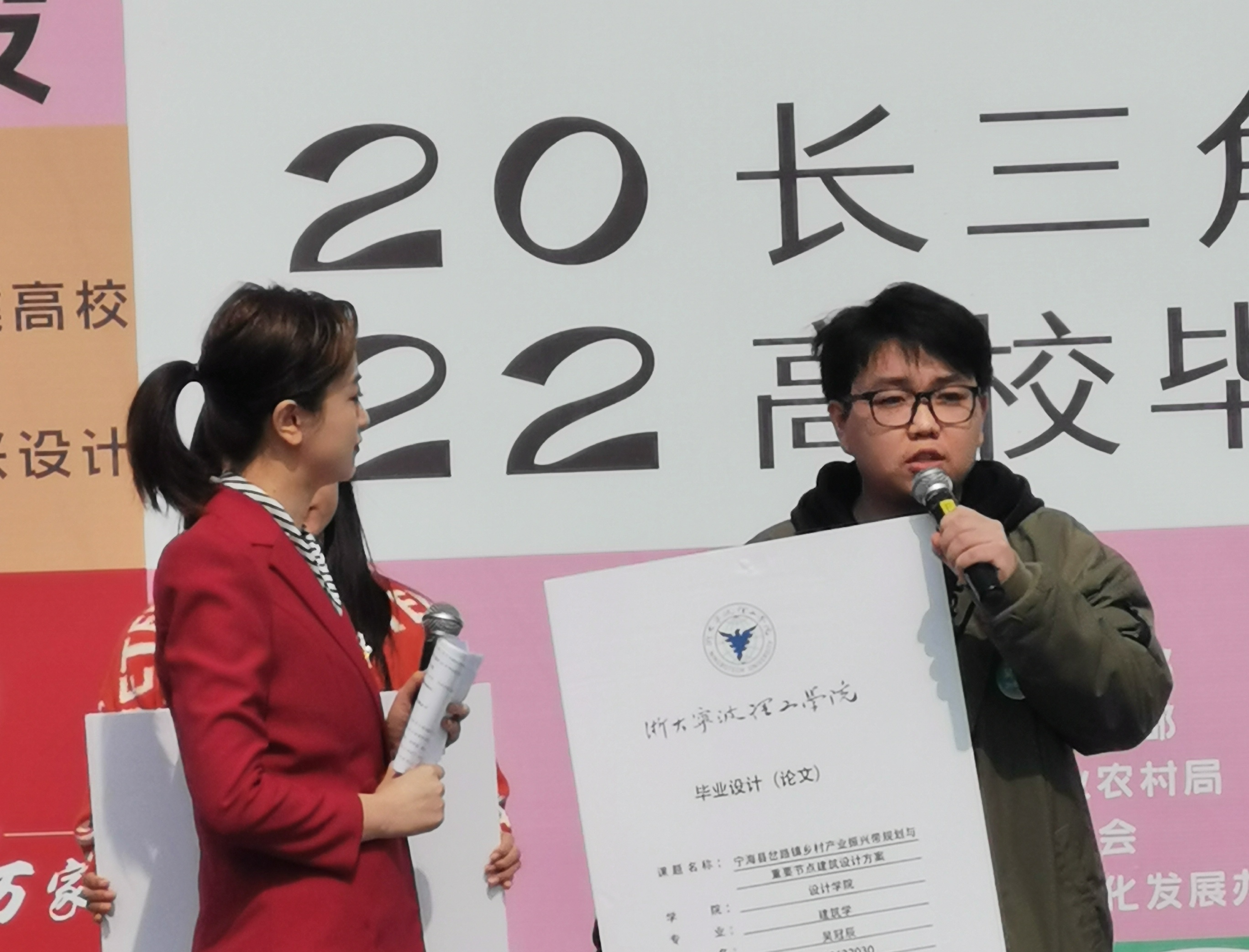 12所院校的学生代表介绍了自己的毕业课题,并共同宣读《青年服务乡村振兴倡议书》。我校学生吴冠辰同学这样讲到,“自己对于乡村改观了太多,这是一个被赋予无穷可能性的新起点,正如‘把设计做在大地,把设计做进乡村’,所做的东西要能用、能留,由过去印象中破败的景象变成一个富有生机活力的地方,年轻人也愿意住的地方”。同时,吴同学还详细介绍了我校学生的两组课题,“我们的选题对于乡村的品质文化圈、产业振兴带进行整体规划与重要节点建筑设计,产业是经济基础可以带动文化发展,而文化也为产业的振兴加速提质,两者相互融合彼此促进,为乡村振兴、共同富裕贡献力量。”