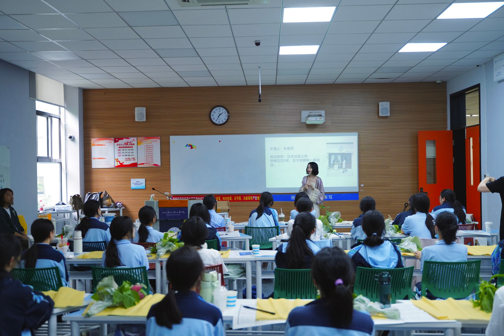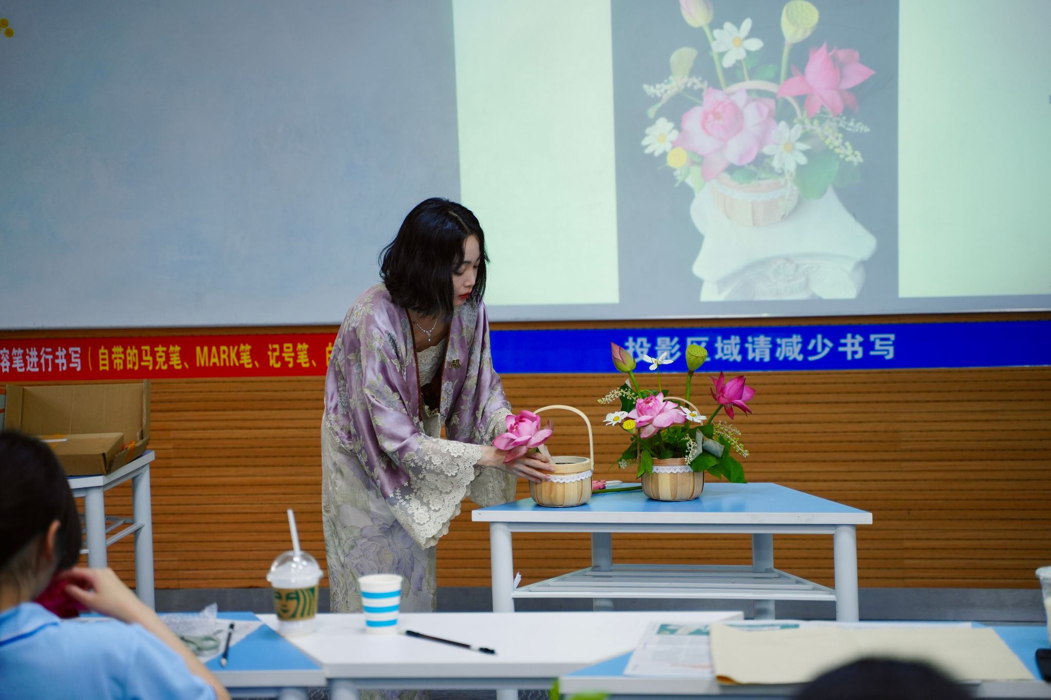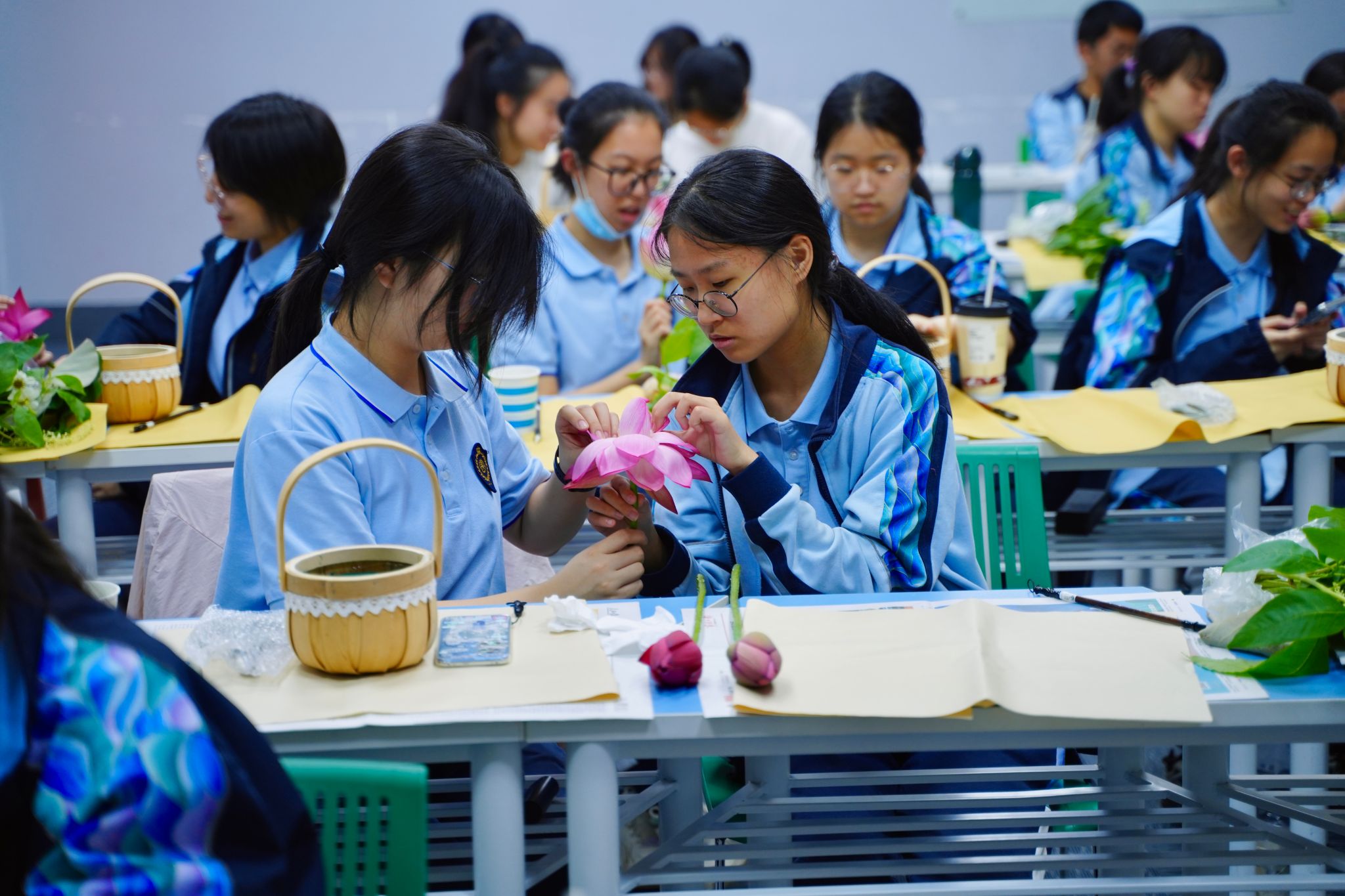 移步花艺教室,一场心灵疗愈的创作正在进行。在老师的指导下,同学们放慢节奏,用心感受花材的触感与芬芳。专业教师演示传统插花"起把宜紧,瓶口宜清"的要诀时,特别强调:"疏影横斜要有留白之美,就像我们的心灵也需要适当的空间来休憩。"