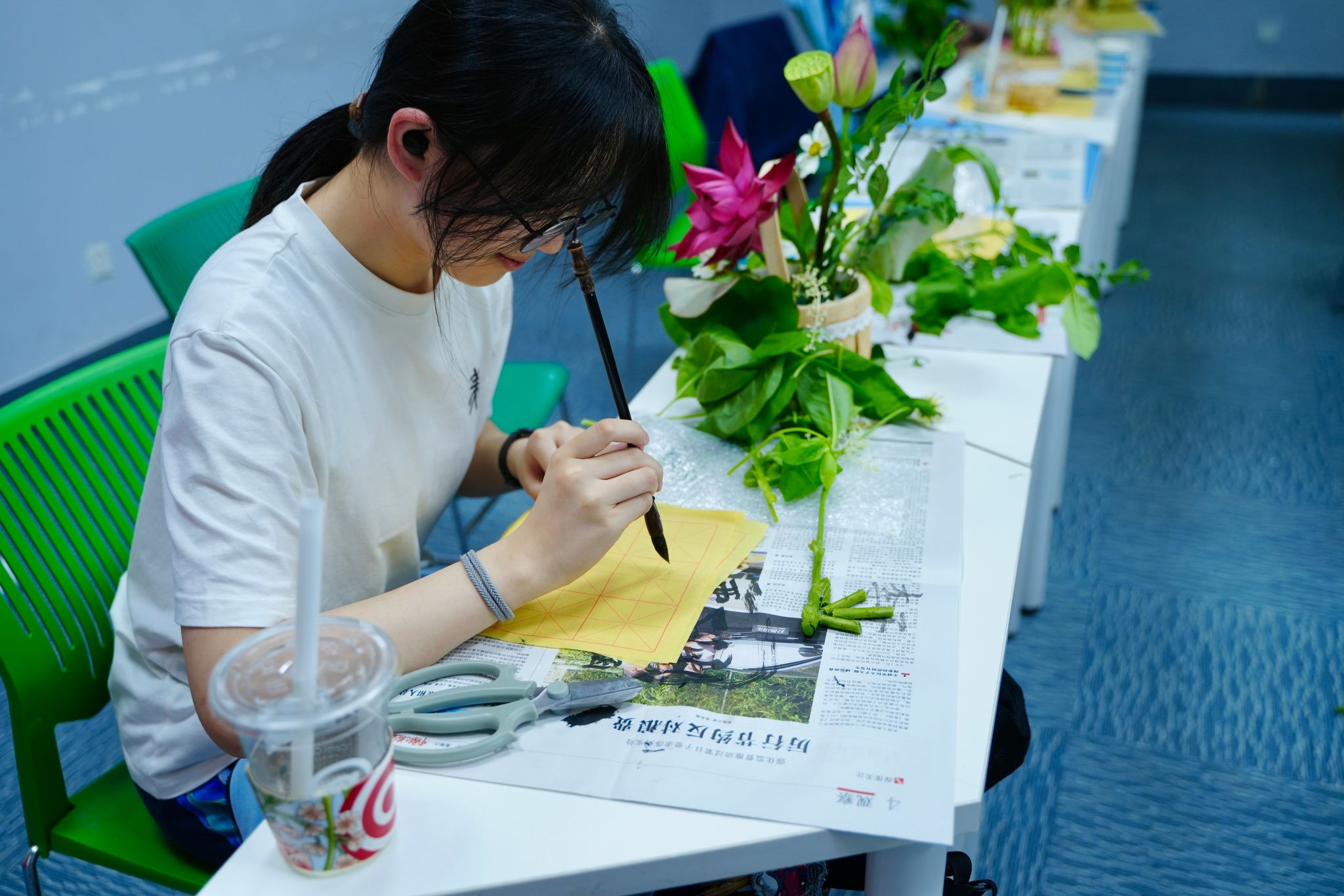 宣纸铺展,墨香氤氲。书法疗愈课上,江彬老师先是向同学们阐释了书法的奥妙精深。继而,他现场为同学们展示了书法的魅力。讲解结束后,江彬带着同学们拿起空白扇面,将刚学到的书法技巧运用其中。同学们感受到的不仅是文化传承,更是一种心灵的抚慰。