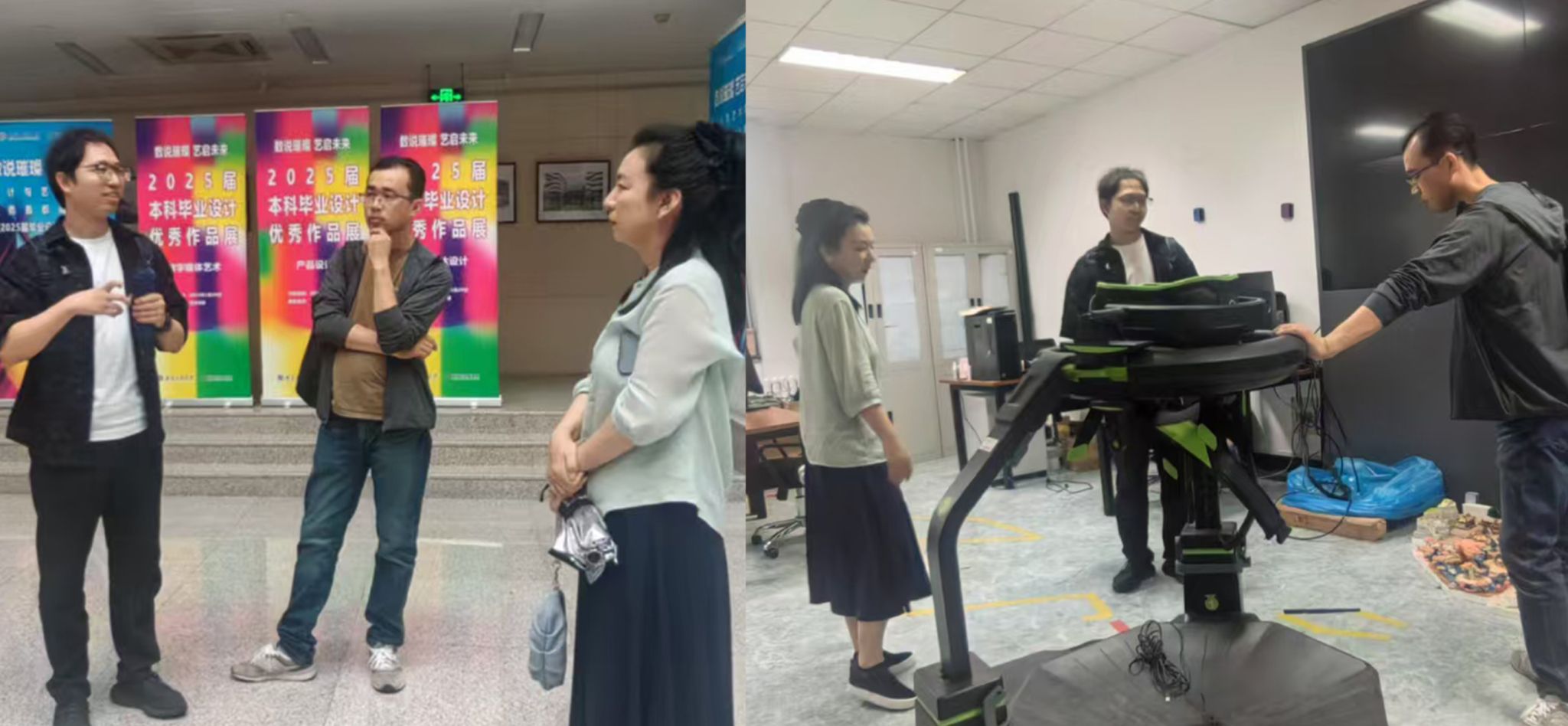 调研团在北京工商大学与设计与艺术学院副院长吴思淼、数字媒体艺术系主任陈思等进行了座谈交流,重点围绕课程体系构建、师资队伍建设、校企合作等方面展开讨论。北工商作为应用型高校,注重强化实践教学环节,提升学生综合能力,在校企合作中积累了丰富经验。调研团还参观了北工商毕业设计展览和实验室,实地考察了学生创新设计成果和教学科研条件,对该校"以赛促教、以赛促学"的实践教学模式有了更直观的认识。