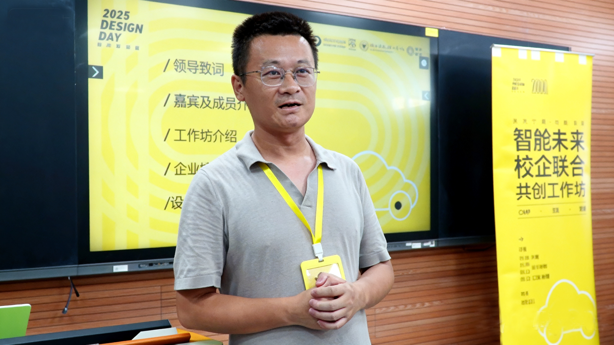 开营仪式上,王祖耀在致辞中强调,本次工作坊是专业教育积极拥抱产业变革、勇于接受实践挑战的重要体现。他指出,智能座舱作为未来出行的核心载体,正在重塑人车关系与出行体验,这为同学们提供了锻炼系统设计能力与创新思维的绝佳平台。面对产业技术的快速迭代,王老师鼓励同学们以开放心态拥抱变化,在真实的产业语境中接受挑战、展现专业价值。随后,工业设计研究所贾鑫老师详细介绍了工作坊的主题框架与日程安排,为同学们勾勒出清晰的学习路径与成果预期。