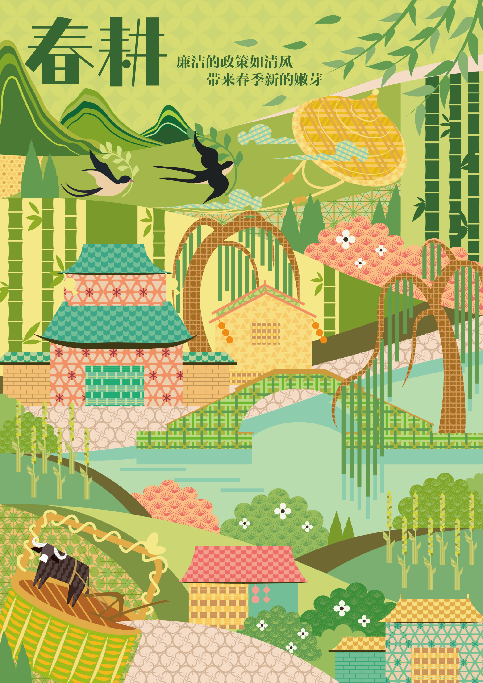 春风拂过江南,揉竹香入白墙黛瓦。新生翠竹是乡村脊梁,匠人破竹成篾,织千年风骨,竹编纹样融入老屋、廊桥,阳光印出“正直”光影,这是竹与乡村对话,是清廉精神在乡土栖居。