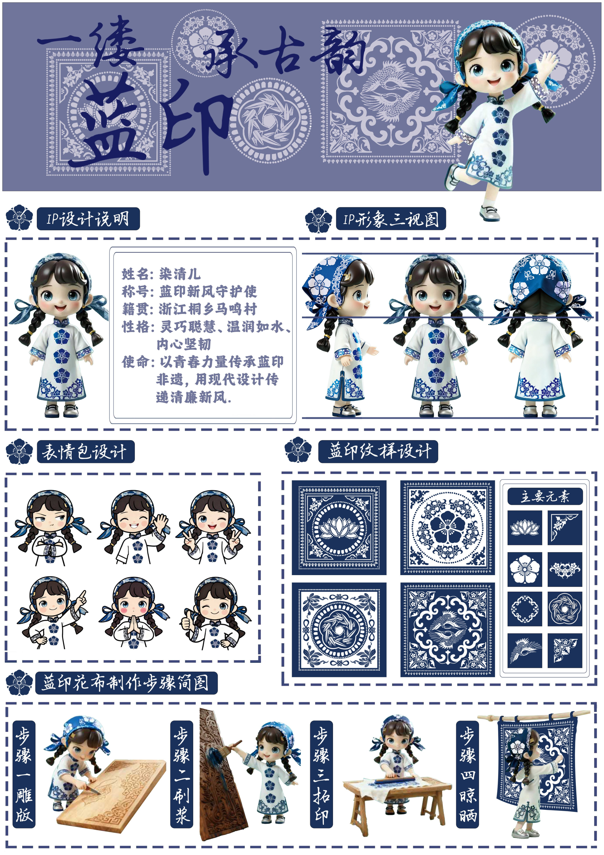 时光深处,有一种蓝叫「非遗蓝印」,它曾浸染江南布匹,纹样藏风骨,色彩显厚重。此次,我们让它遇见青春。于是,IP「染清儿」从染缸跃出,头顶未绽蓝莲,眼眸清亮,身上有古老纹样,带着治愈笑容。它不说教,静坐在手账本上,将“清廉”化作笔端蓝;它不沉重,爬上帆布包,让出行带清风;它还跳进手机壳、咖啡杯、夜灯里,深夜发光时说:“清白的人生,自有光。”