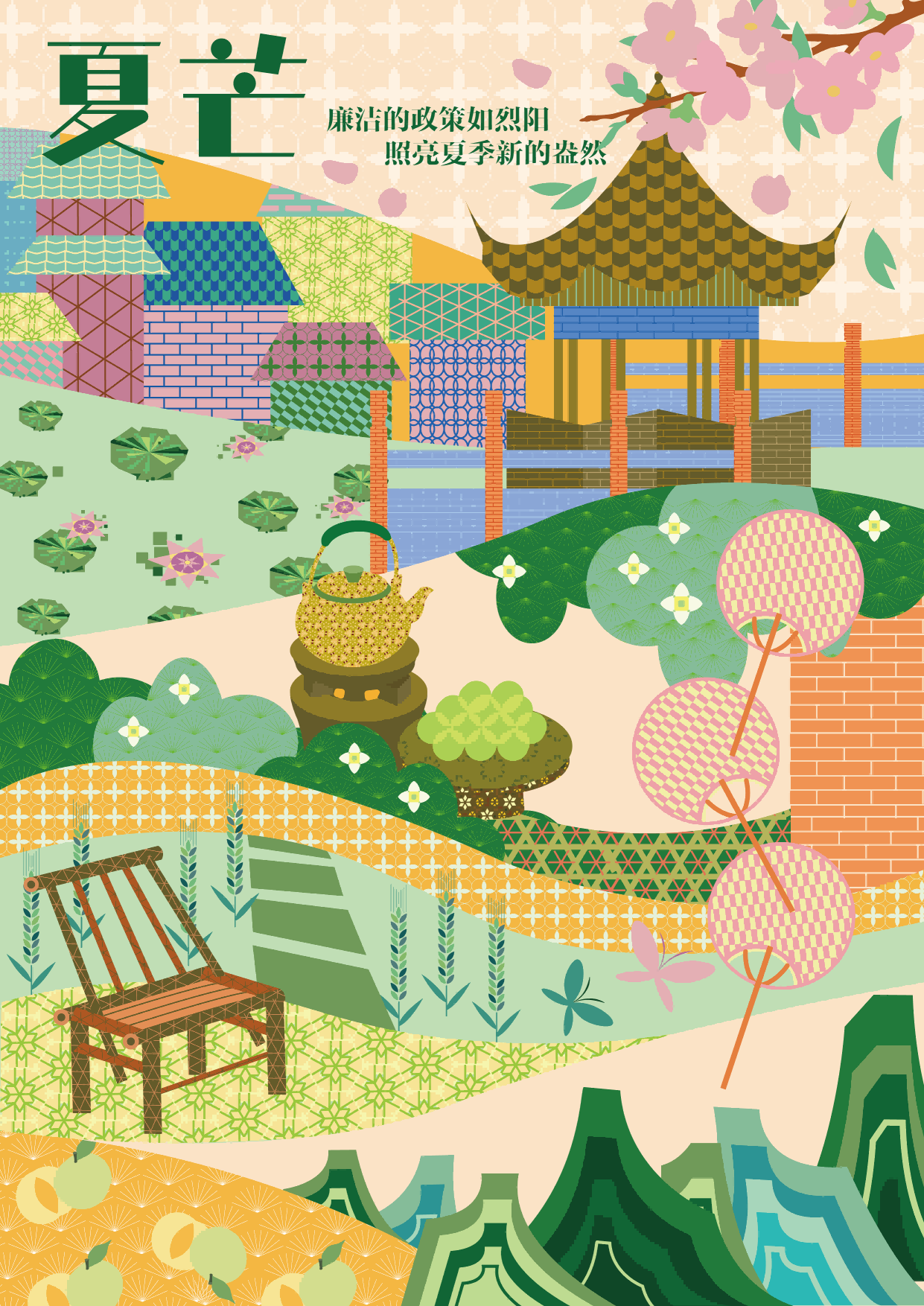 夏日雨洗天地,荷塘畔文化礼堂飞檐翘角,竹编纹样与木质结构榫卯相合,通风明亮。村民于此议事,清正包容。政策如雨露,老旧院墙以竹篾、夯土重获新生,兼具乡愁与年代气息。