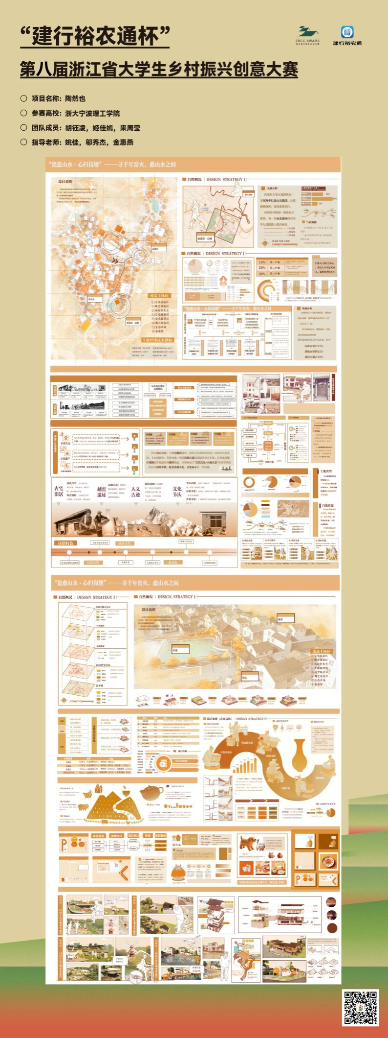 设计学院团队的作品《陶然也》获第八届浙江省大学生乡村振兴倡议大赛银奖。小组成员认为,乡村振兴需要关注人情和实业结合,推动产业与文化共同发展。固团队决定打造“陶然也”青瓷疗愈的文化ip,串联茶园、农家乐、旅游等原生经济。