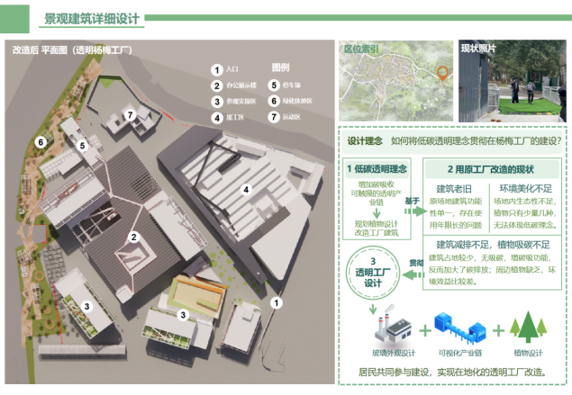 “乌托梅香·透明生长纪”团队通过理论研究、实践探索与行动落地三阶段系统推进,以“文化赋能乡村振兴”为核心理念,深度挖掘乾炳村杨梅文化底蕴,创新构建三位一体的景观设计体系。通过景观节点创新设计,推动乡村形象提升与文旅吸引力构建。方案重点打造“透明工厂”产业观光区、“杨梅研学”