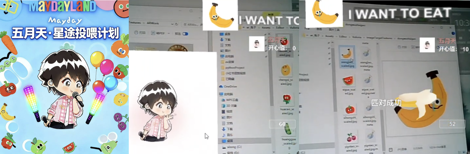 针对线下粉丝与五月天互动场景受限的问题,结合VR沉浸式体验与IP粉丝经济,打造一款粉丝向VR投喂互动小游戏;应用场景为五月天线下应援活动、线上粉丝社群的VR体验区;预期目标是提升粉丝参与感,同时验证IP+VR轻互动游戏的趣味性与可行性,突出“粉丝沉浸式陪伴”的项目价值。