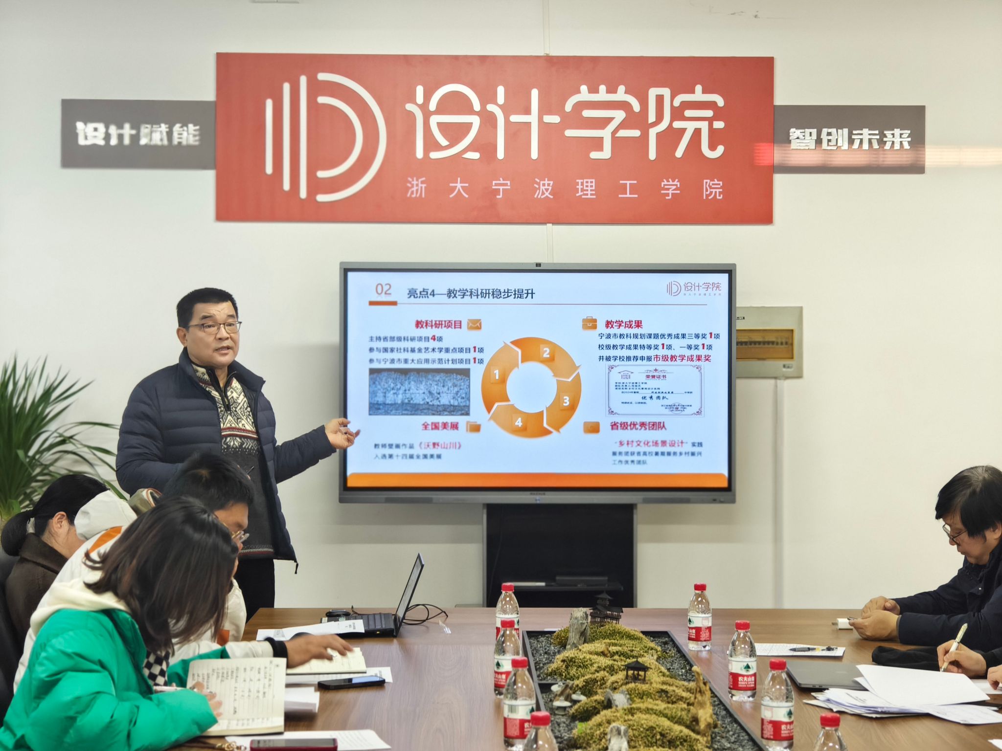 陈江首先代表学院班子进行述职述廉汇报。他指出,2024年在学校的正确领导和学院师生共同努力下,学院教学科研稳步提升,硕士点建设扎实推进,重点学科专业实现突破,人才引进取得积极成效,教师作品入选第十四届全国美展,学生作品登上央视新闻,毕业生就业率名列前茅;积极承办国际会议,展览展会精彩纷呈,设计影响力逐步扩大;大力开展学科竞赛和创新创业,国际交流持续拓展,地方合作深入推进。接下来,要积极培育高层次项目、平台和成果,力争实现新突破,提升申硕竞争力;要加快人才引进和培养,进一步强化师资力量;要合理调配空间资源,进一步改善办学条件。